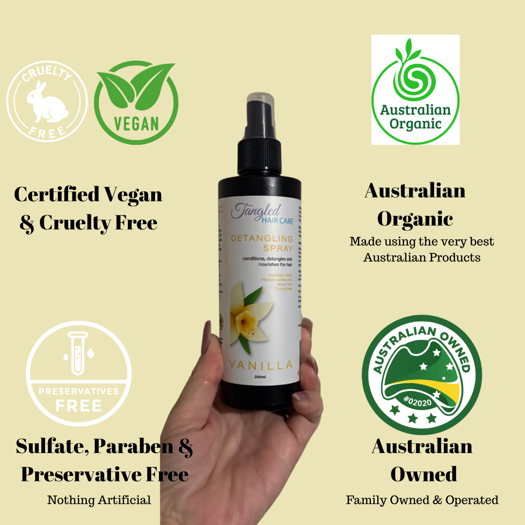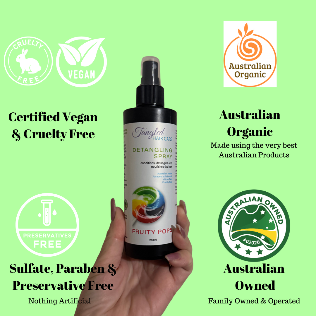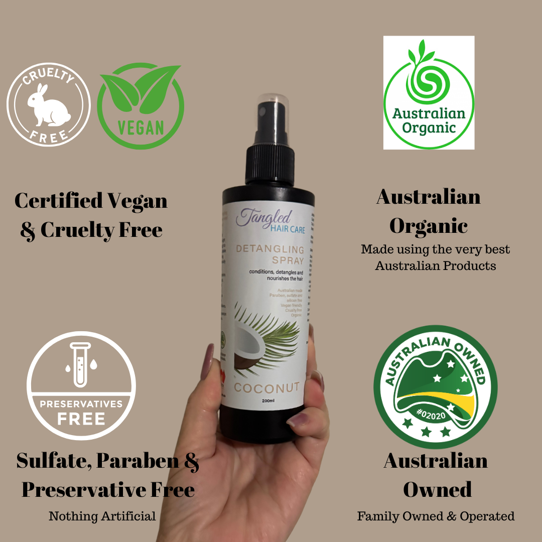 Our Detangle Sprays contains a unique blend of organic, natural ingredients and nothing artificial - no parabens, no sulfates, no silicons, no alcohol, no emulsifiers and no stabilisers.
