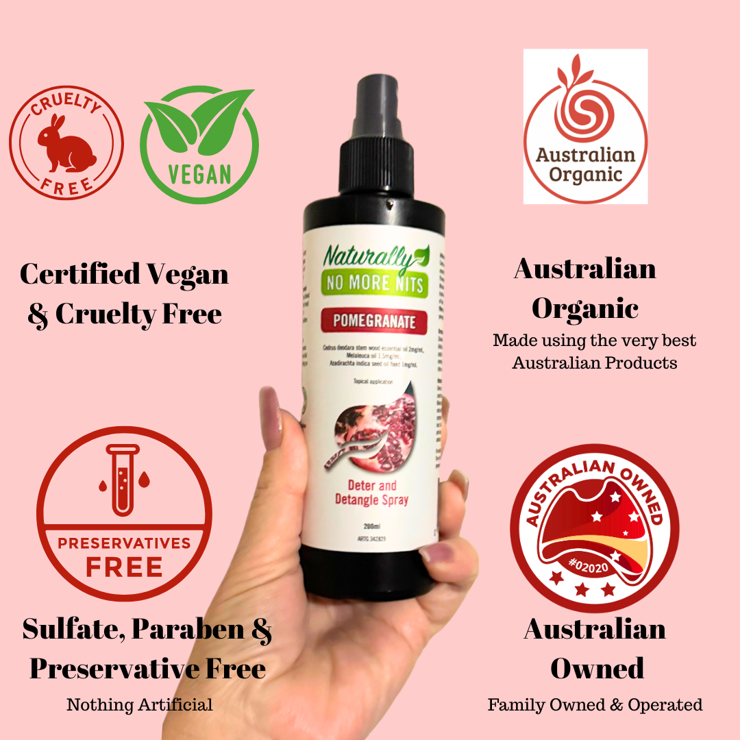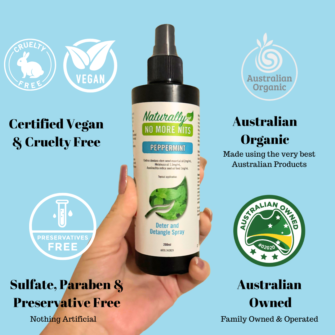 Naturally No More Nits Deter and Detangle Spray contains a unique blend of natural ingredients and NO NASTIES – no parabens, no alcohol, no emulsifiers and no stabilisers – all of which may irritate the skin and dry the scalp.